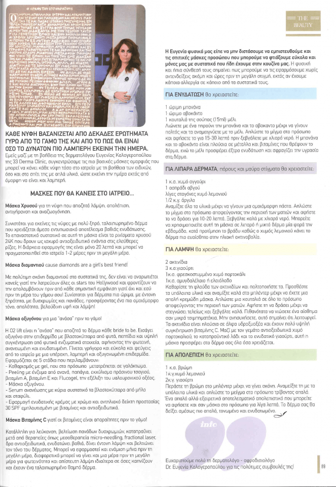 Κάθε νύφη βασανίζεται από δεκάδες ερωτήματα γύρω από το γάμο της και από το πώς θα είναι όσο το δυνατόν πιο λαμπερή εκείνη την ημέρα. Mε τη βοήθεια της δερματολόγου Ευγενίας Καλογεροπούλου της 33 Derma Clinic, συγκεντρώσαμε τις πιο αποτελεσματικές μάσκες ομορφιάς που μπορεί να κάνει κάθε νύφη τόσο στο ιατρείο με τη βοήθεια των ειδικών, όσο και στο σπίτι με απλά υλικά, ώστε την μεγάλη μέρα εκτός από όμορφη να είναι και... λαμπερή.